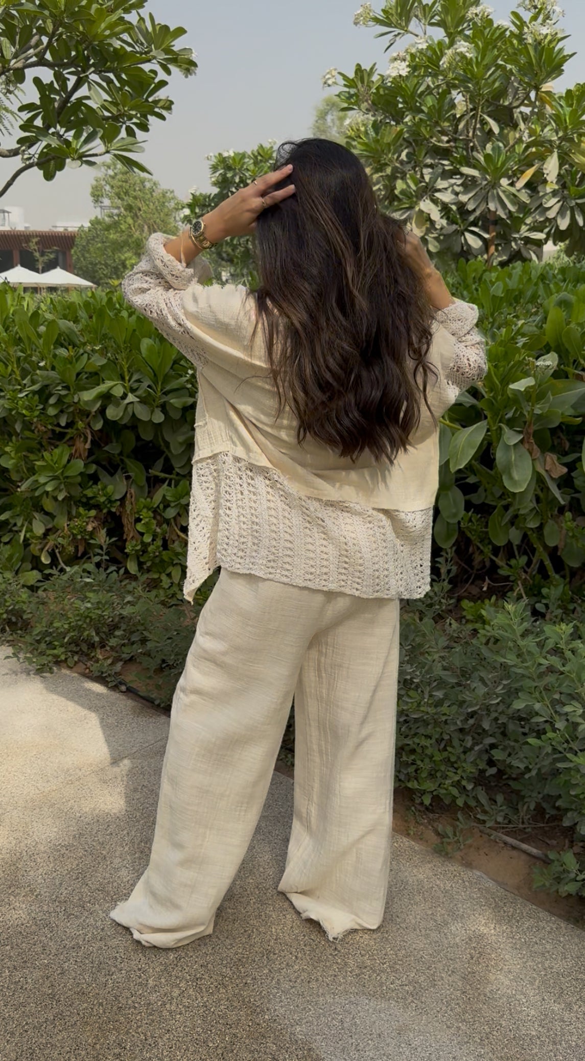 Relaxed shirt and wide-leg pants featuring open-knit inserts