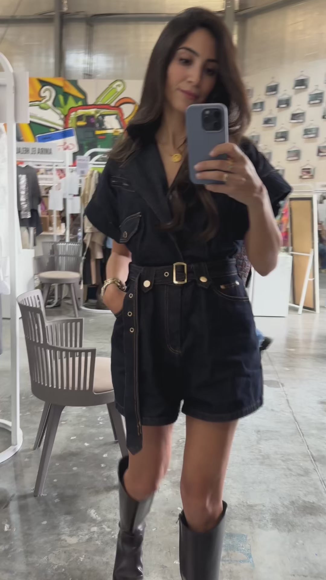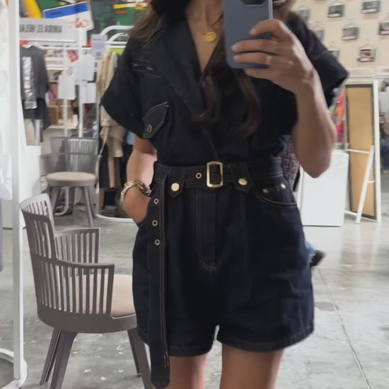 A tailored short jumpsuit with Sharp shoulders and a cinch