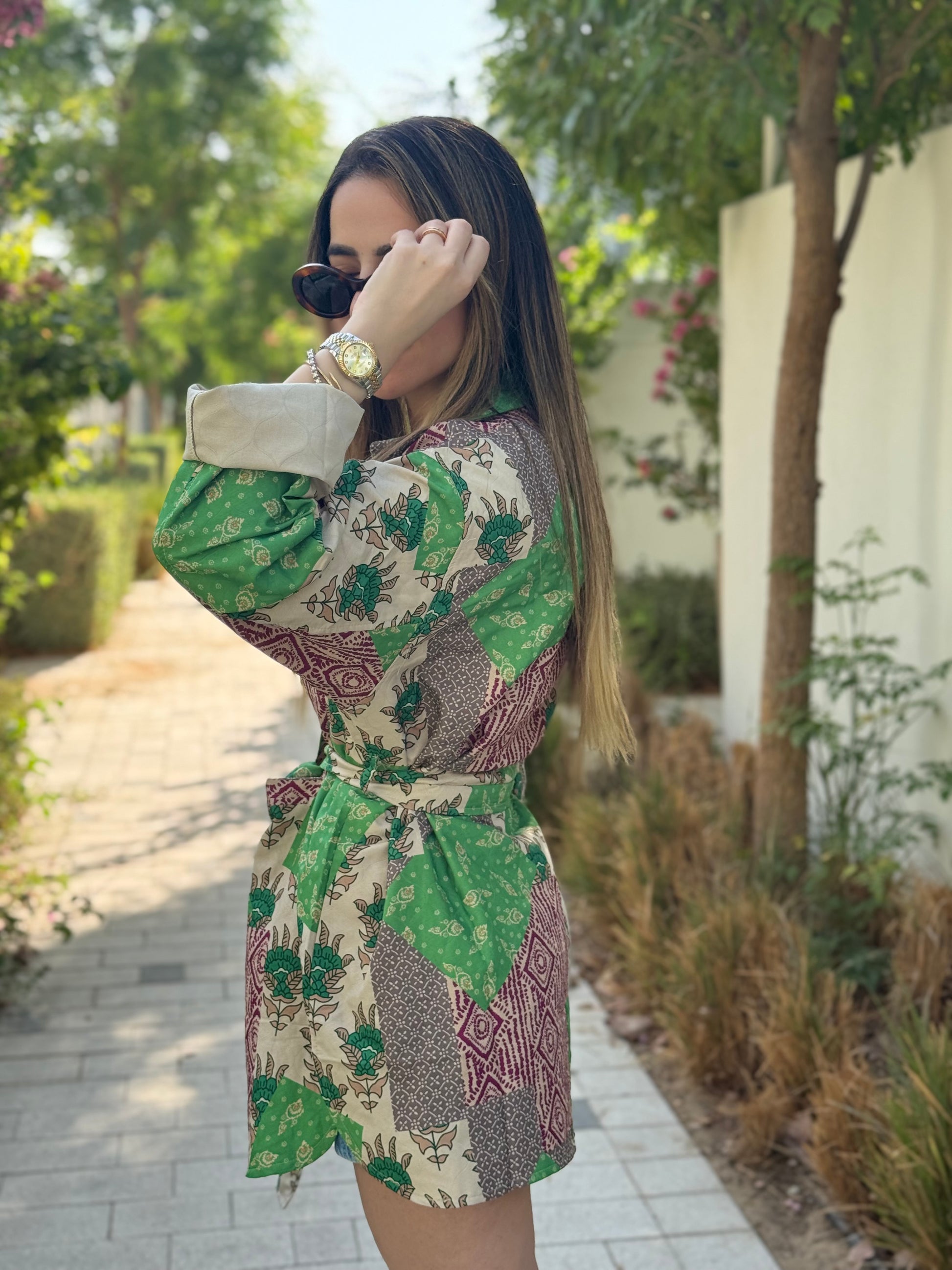 Belted statement layering piece featuring floral and geometric prints