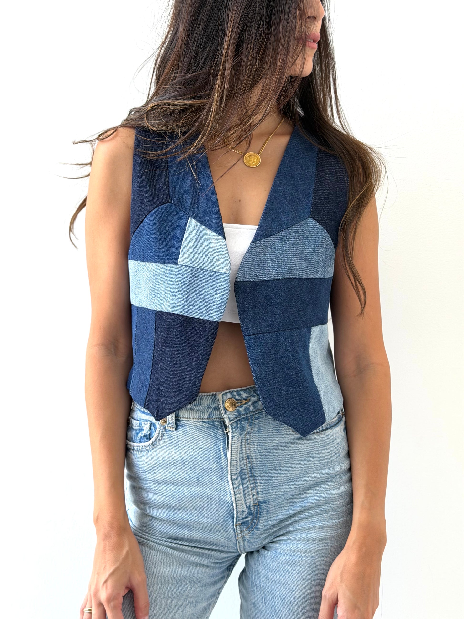 Cropped denim vest featuring mixed blue washes & patchwork detailing.